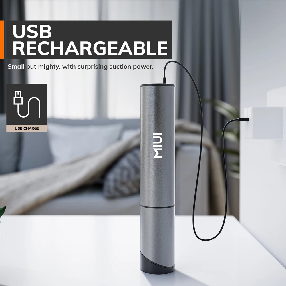 MIUI cordless vacuums can be charged directly indoors, in the car or on the computer’s USB port, making them very suitable for home, car, office and outdoor environments.