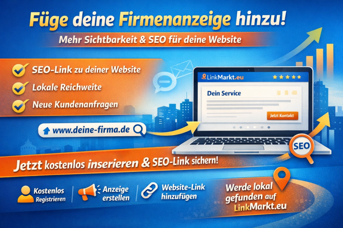 Auf LinkMarkt.eu kannst du deine Dienstleistung oder Firma inserieren und einen direkten SEO-Link zu deiner Website hinzufügen.
