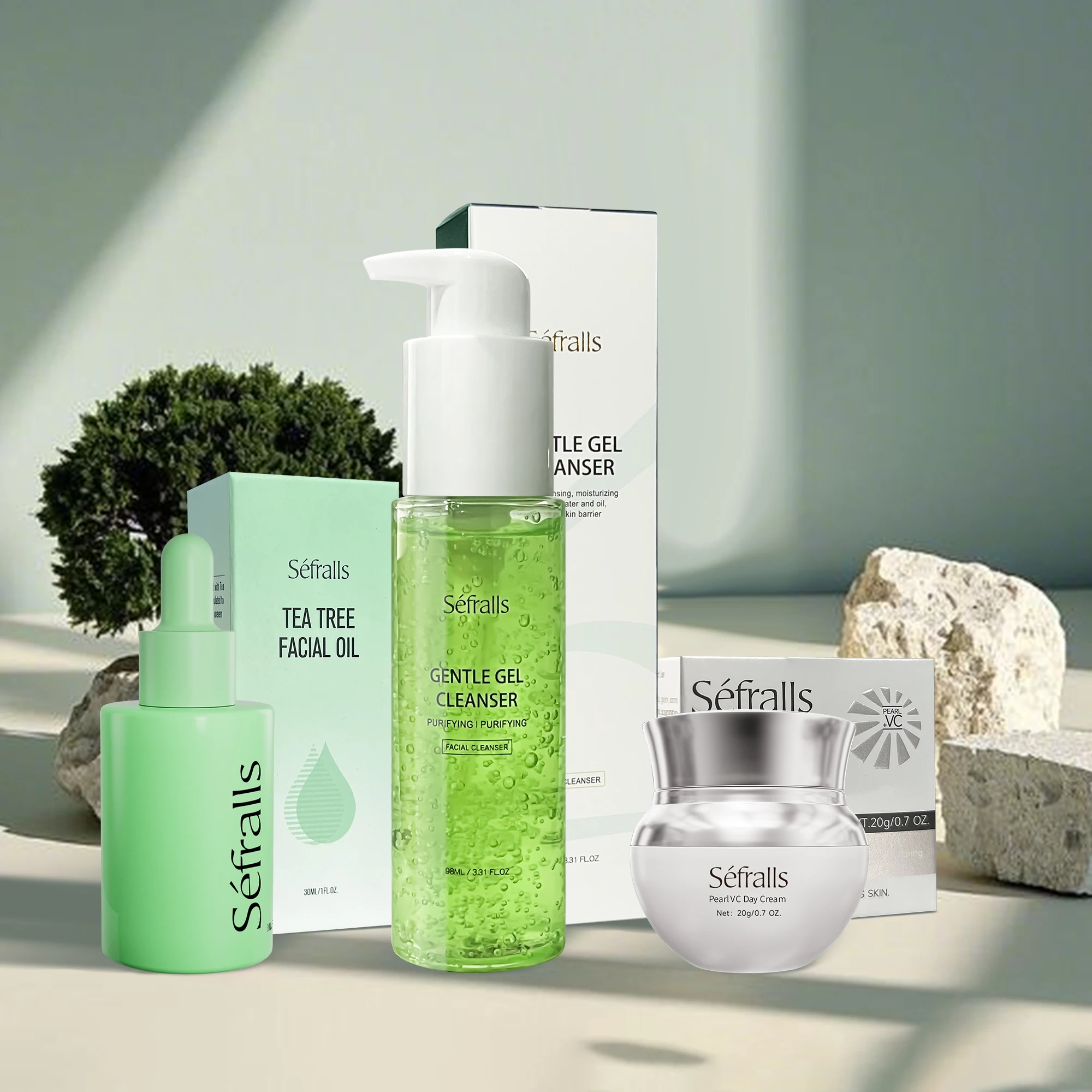 Das Séfralls 3-in-1 Hautpflegeset kombiniert natürliche Inhaltsstoffe zur täglichen Pflege empfindlicher, unreiner und müder Haut. Mit Aloe Vera Gel zur sanften Reinigung, Teebaumöl zur Aknebehandlung und Pearl VC Creme für einen strahlenden Teint bietet dieses Set eine komplette Pflegekur für das Gesicht – hydrierend, klärend und aufhellend.