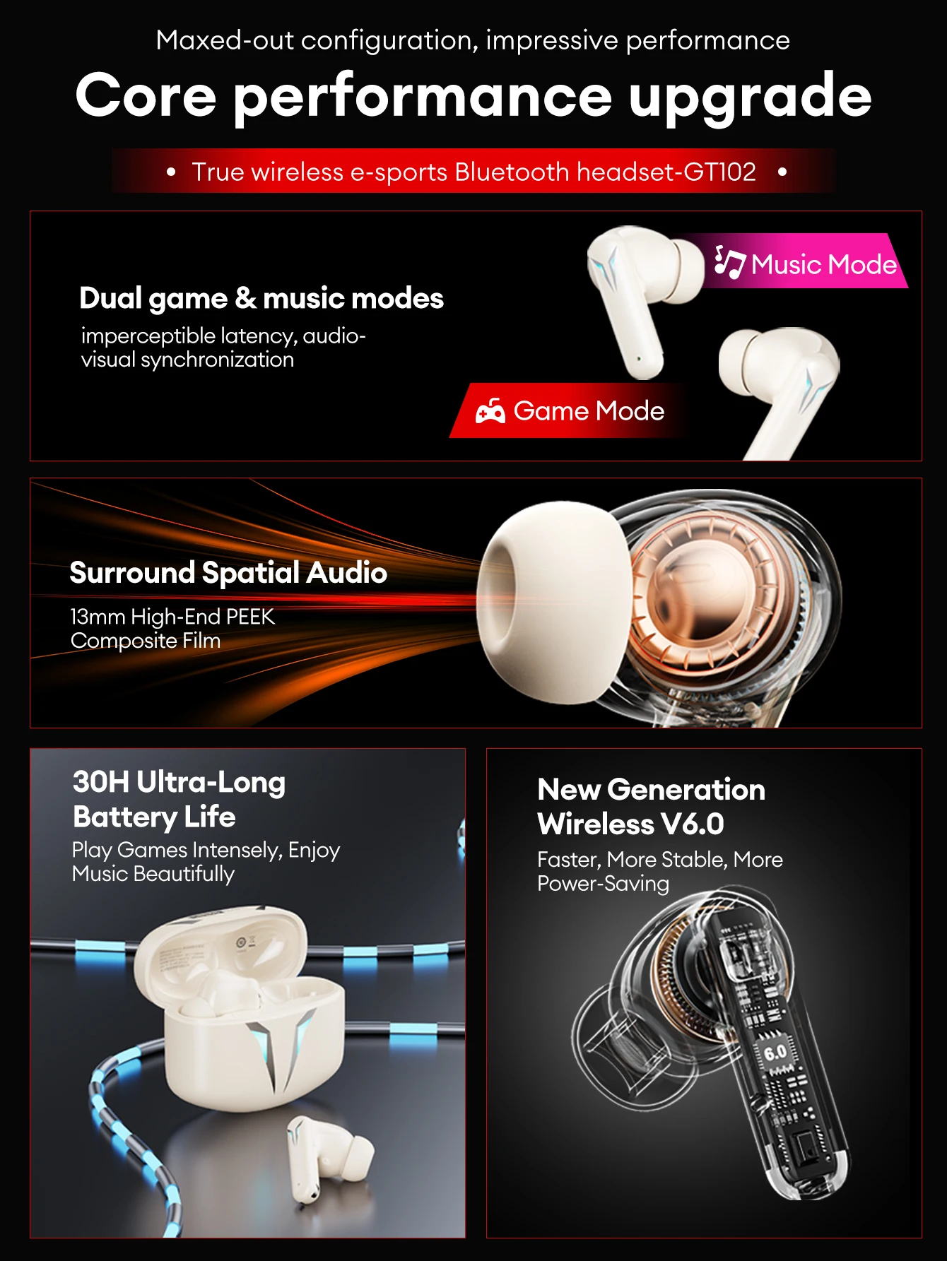 Die Lenovo GT102 True-Wireless Gaming Kopfhörer wurden speziell für anspruchsvolle Nutzer entwickelt, die Wert auf schnelle Audioübertragung, klaren Klang und maximale Bewegungsfreiheit legen. Dank Bluetooth 6.0 gewährleisten die Earbuds eine stabile Verbindung mit besonders niedriger Latenz – ideal für E-Sports, Mobile Gaming und Videos.