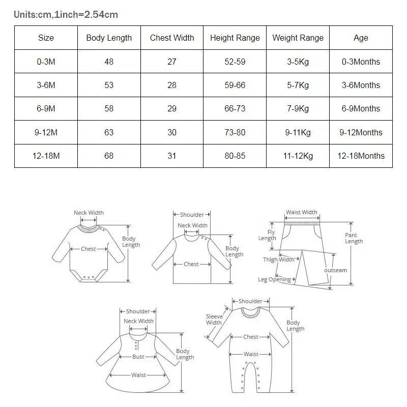 Größen: 0–3M, 3–6M, 6–9M, 9–12M, 12–18M