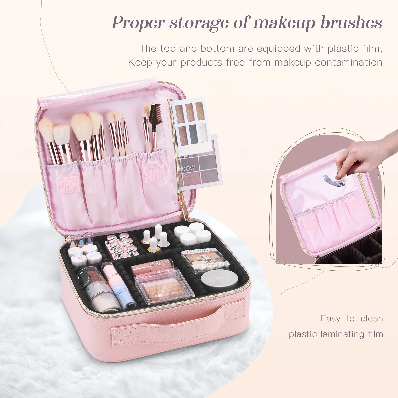 The Makeup organizer bag is equipped with a makeup brush layer that can hold more than 20 brushes of different sizes.