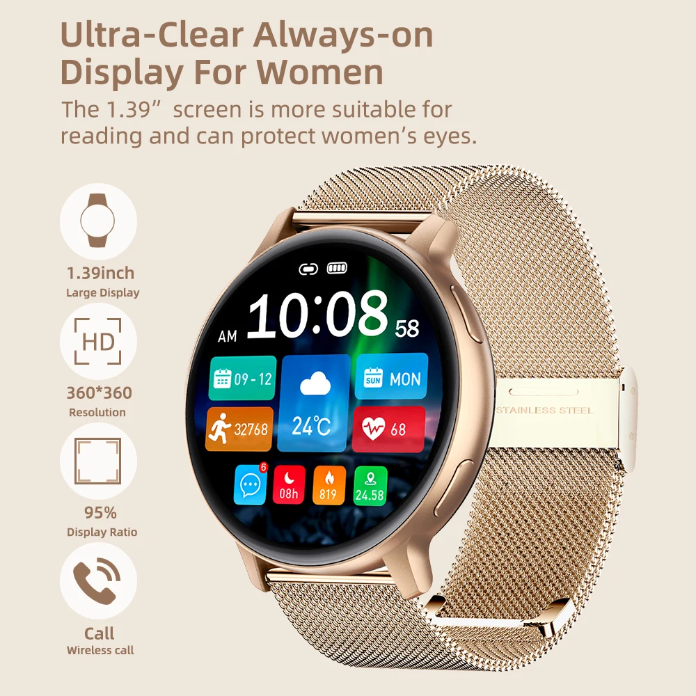 Elegante Damen Smartwatch mit Bluetooth-Telefonie, Fitness-Tracking, Gesundheitsfunktionen und 1,39″ HD Touchscreen – kompatibel mit Android & iOS.